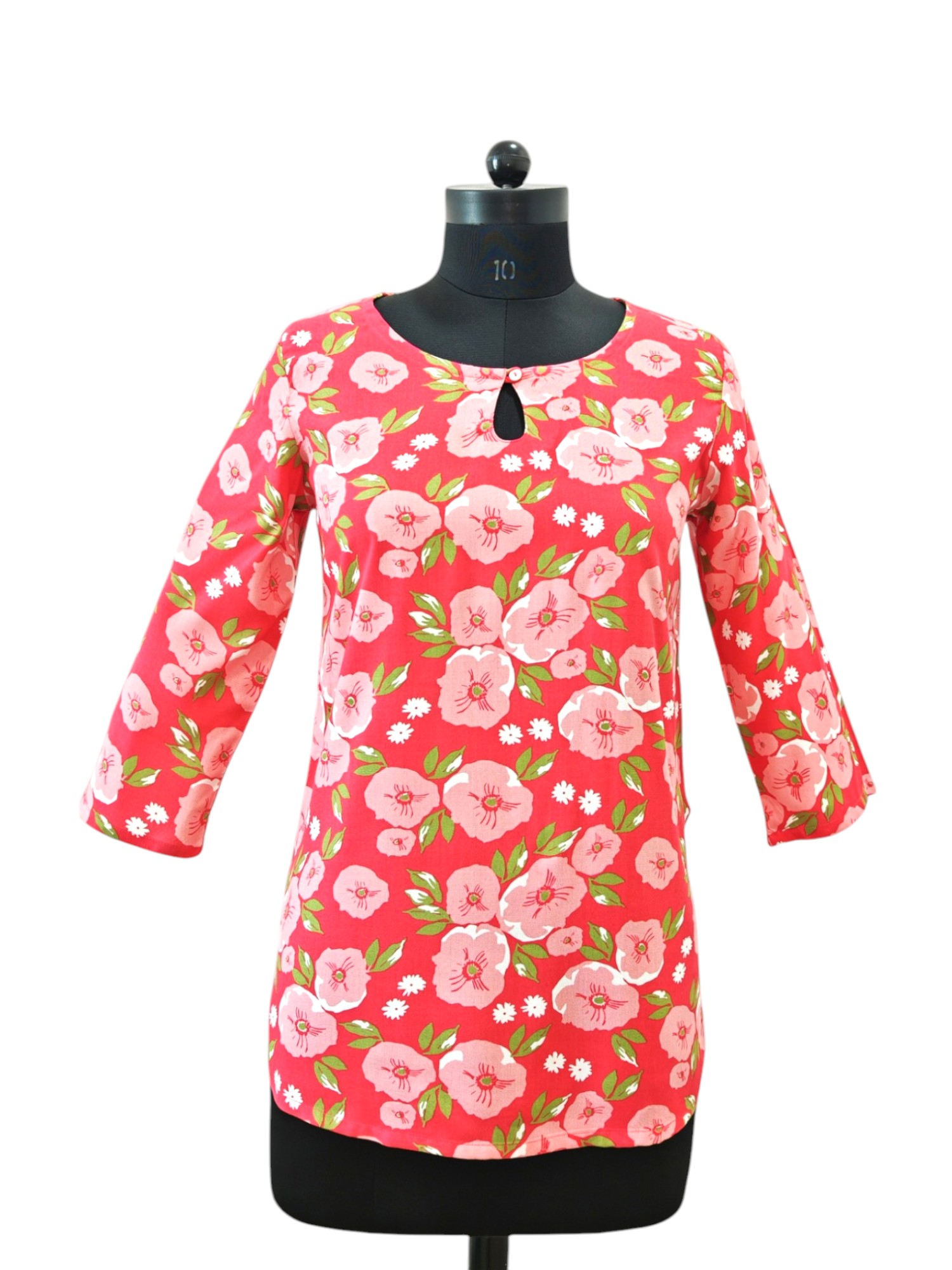 This vibrant floral tunic top features a cheerful red base adorned with pink blossoms and green leaves, perfect for adding a pop of color to any wardrobe. The round neckline with a keyhole and button detail adds a touch of elegance to its casual charm. Designed with three-quarter sleeves and a relaxed fit, it offers both comfort and style for everyday wear. Pair it with jeans or leggings for a fresh and effortless look.
