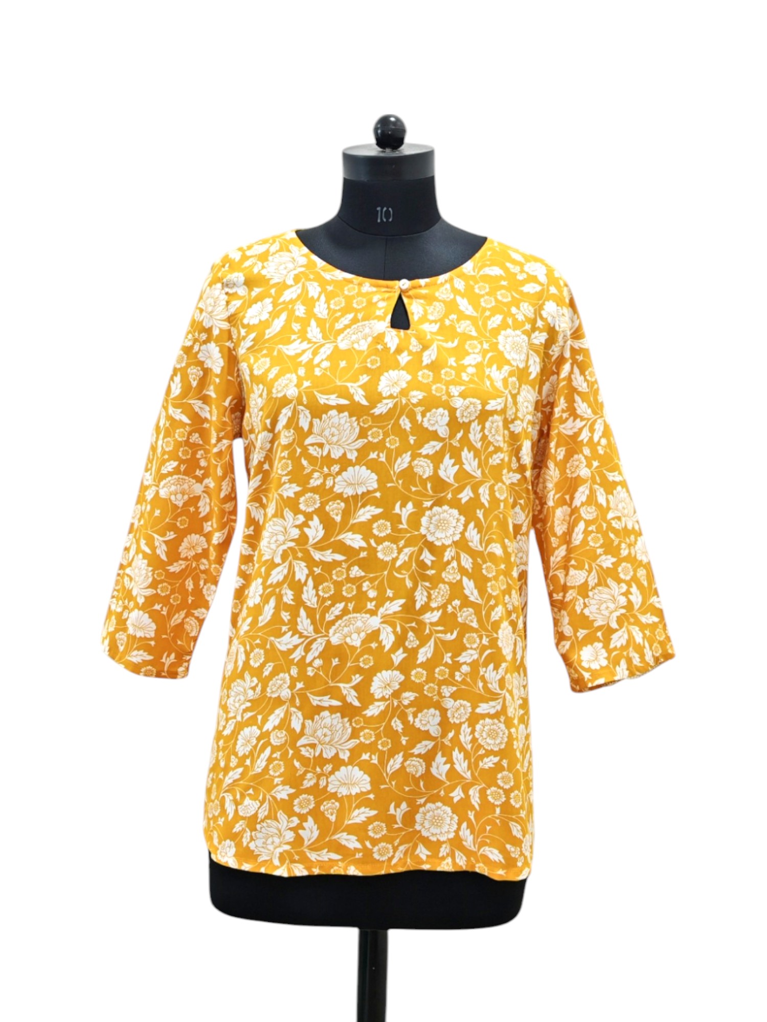 This is a vibrant mustard yellow top adorned with an elegant white floral print. It features a round neckline with a subtle teardrop cutout accentuated by a button. The three-quarter sleeves add a touch of casual sophistication. Perfect for a sunny day out, this top blends elegance with cheerful charm.